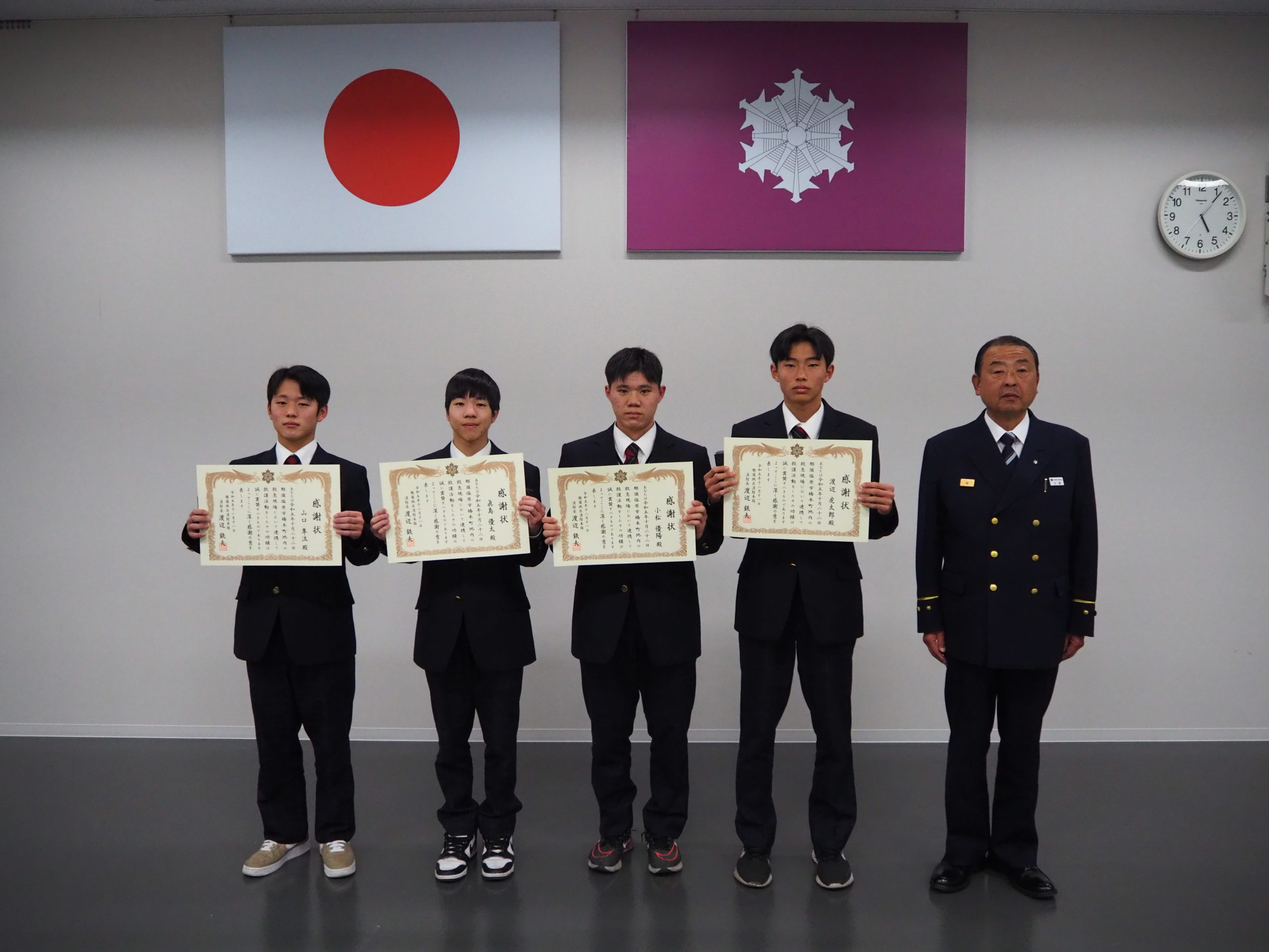 那須清峰高等学校1年の渡辺虎太郎さん、小松優陽さん、眞島優太さん、山口隼汰さんは、令和5年10月22日(日)に那須塩原市橋本町地内で発生した救急事案において、連携して救護活動を行い、人命救助に多大な貢献をされました。
